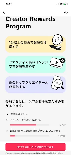- 例えば、再生数に応じて収益が得られる「Creator Rewards Program」は10000フォロワー以上いないと参加できないプログラムとなっています。他にも「アーティストに協力」という興味のある有料楽曲を選んで、その曲を使って動画を作成して投稿し、動画の視聴回数などが増えるほど収益が発生するプログラムがあります。しかし、このプログラムに参加するためには1000フォロワー以上いることが条件に入っています。