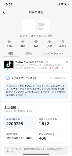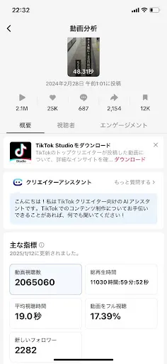 - 動画の視聴回数、いいね数、シェア数、人気のある投稿、フォロワーの年齢、性別を参考に自分の発信内容がターゲットのニーズとズレていないかを確認することができます。